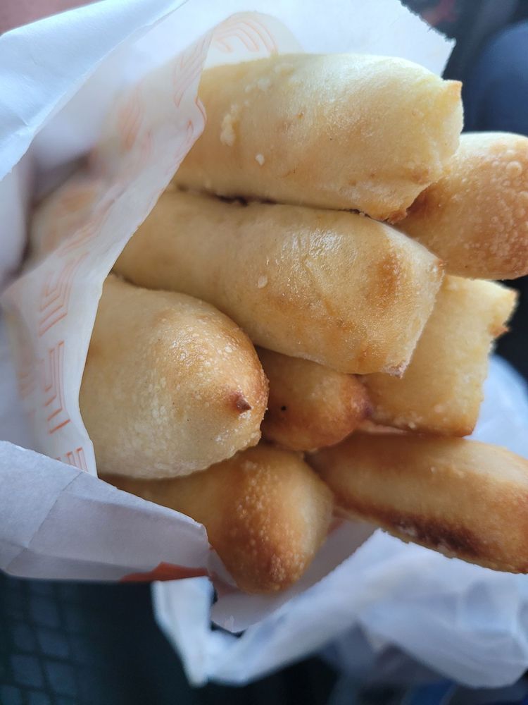 Eight buttery garlic flavored bread sticks, sprinkled with parmesan cheese