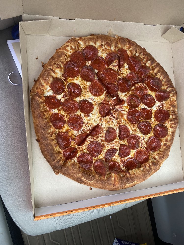 A large Pepperoni pizza topped with over 100 crispy old world Pepperonis all the way to the edge and a crispy, caramelized crust